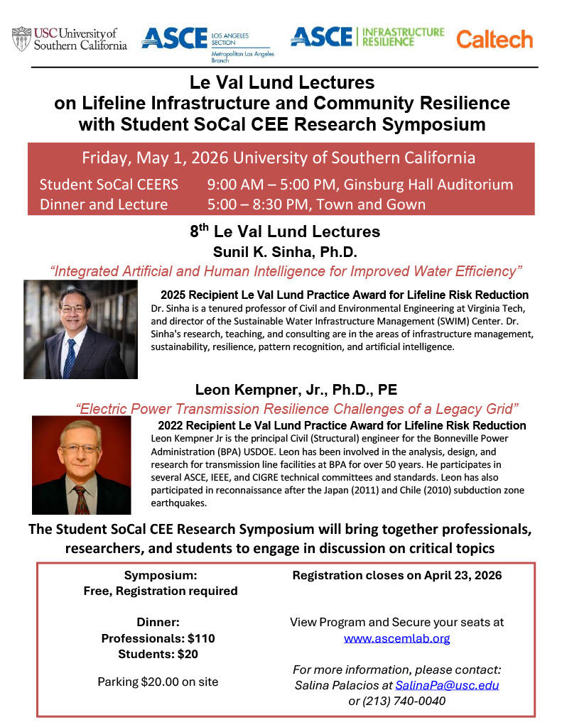 Join ASCE Metropolitan Los Angeles Branch (MLAB), ASCE Infrastructure Resilience Division (IRD), California Institute of Technology (Caltech), and University of Southern California (USC) for the 8th Le Val Lund Lecture on Lifeline Infrastructure and Community Resilience in honor of Le Val Lund at the USC Town & Gown on Friday, May 1, 2026. The lecture will be preceded with an open bar reception and a plated meal dinner.​